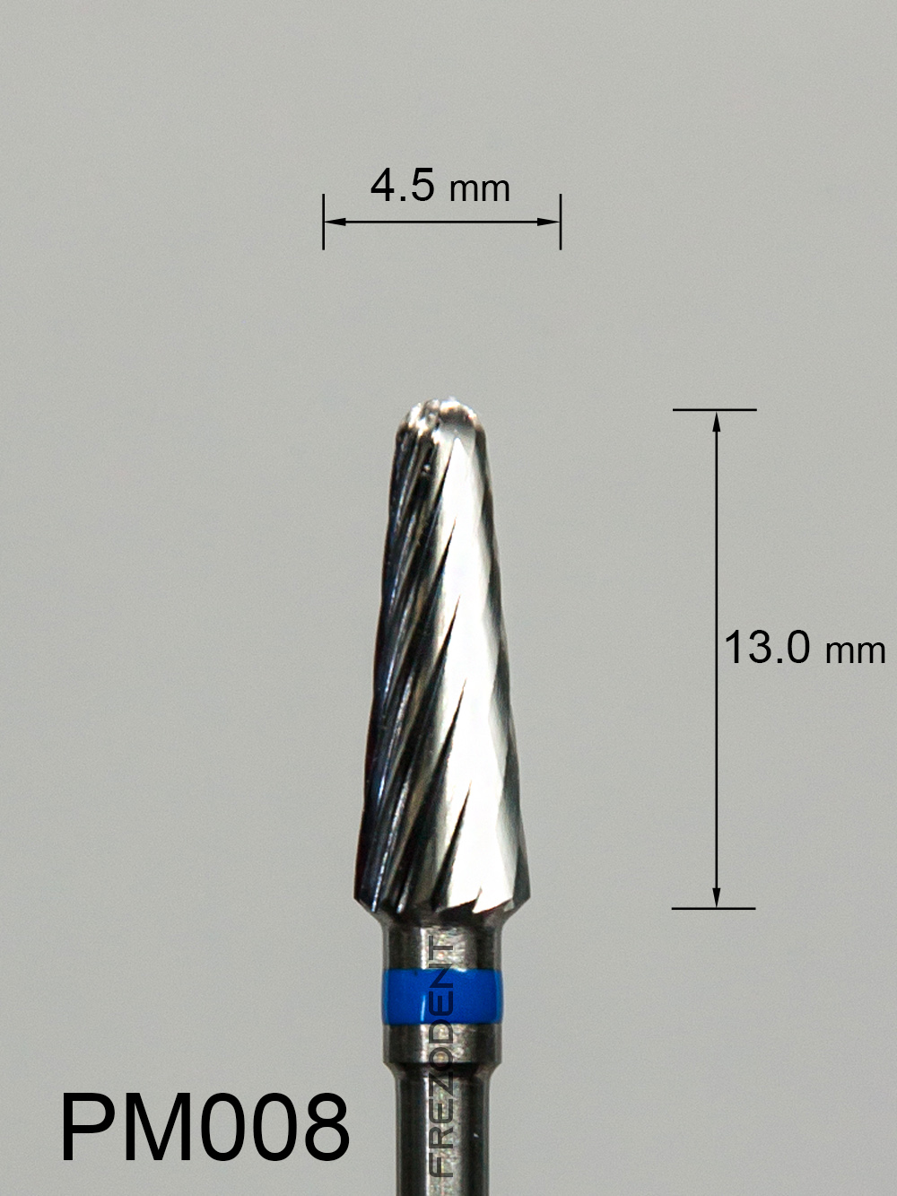 Frez węglikowy PM008 stożkowy z średnim pojedynczym nacięciem (niebieski pasek) to narzędzie do obróbki w technice dentystycznej. Nacięcie pojedyncze zapewnia mniejsze drgania i gładsze wykończenie powierzchni w porównaniu do nacięcia krzyżowego.
