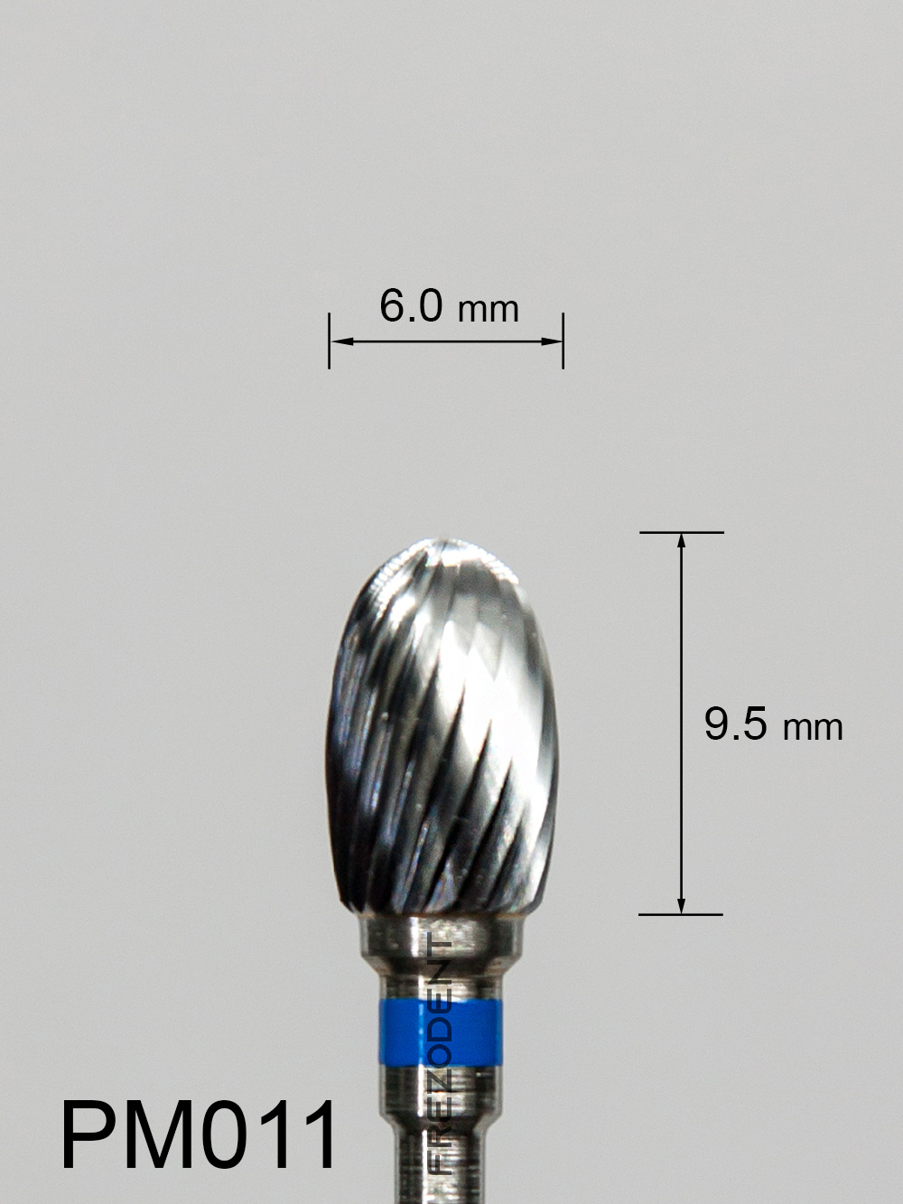 Frez węglikowy PM011 wypukły jajowaty z średnim pojedynczym nacięciem (niebieski pasek) to narzędzie do obróbki w technice dentystycznej. Nacięcie pojedyncze zapewnia mniejsze drgania i gładsze wykończenie powierzchni w porównaniu do nacięcia krzyżowego.