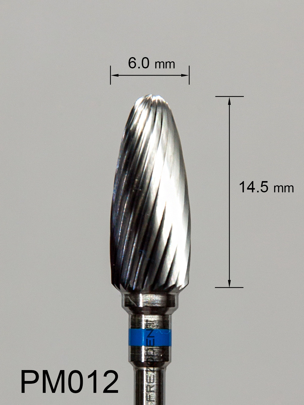 Frez węglikowy PM012 wypukły z średnim pojedynczym nacięciem (niebieski pasek) to narzędzie do obróbki w technice dentystycznej. Nacięcie pojedyncze zapewnia mniejsze drgania i gładsze wykończenie powierzchni w porównaniu do nacięcia krzyżowego.