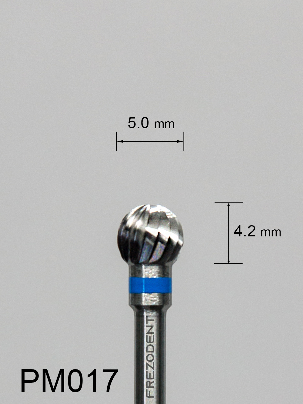 Frez węglikowy PM017 kulkowy z średnim pojedynczym nacięciem (niebieski pasek) to narzędzie do obróbki w technice dentystycznej. Nacięcie pojedyncze zapewnia mniejsze drgania i gładsze wykończenie powierzchni w porównaniu do nacięcia krzyżowego.