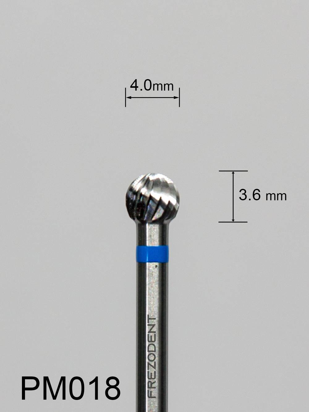 Frez węglikowy PM018 kulkowy z średnim pojedynczym nacięciem (niebieski pasek) to narzędzie do obróbki w technice dentystycznej. Nacięcie pojedyncze zapewnia mniejsze drgania i gładsze wykończenie powierzchni w porównaniu do nacięcia krzyżowego.