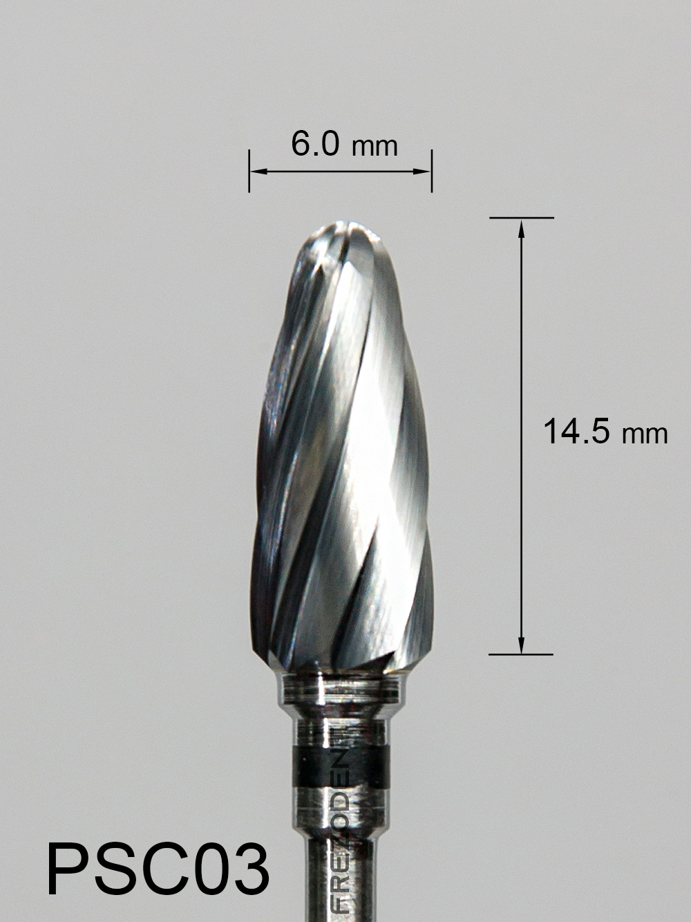 Frez węglikowy PSC03 wypukły z bardzo grubym pojedynczym nacięciem (czarny pasek) to narzędzie do grubej obróbki w technice dentystycznej. Nacięcie pojedyncze zapewnia mniejsze drgania i gładsze wykończenie powierzchni w porównaniu do nacięcia krzyżowego.