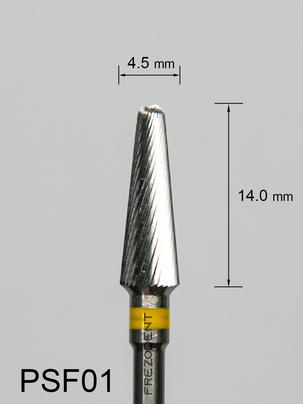 Frez węglikowy PSF01 stożkowy z bardzo drobnym pojedynczym nacięciem (żółty pasek) to narzędzie do precyzyjnej obróbki w technice dentystycznej. Nacięcie pojedyncze zapewnia mniejsze drgania i gładsze wykończenie powierzchni w porównaniu do nacięcia krzyżowego.