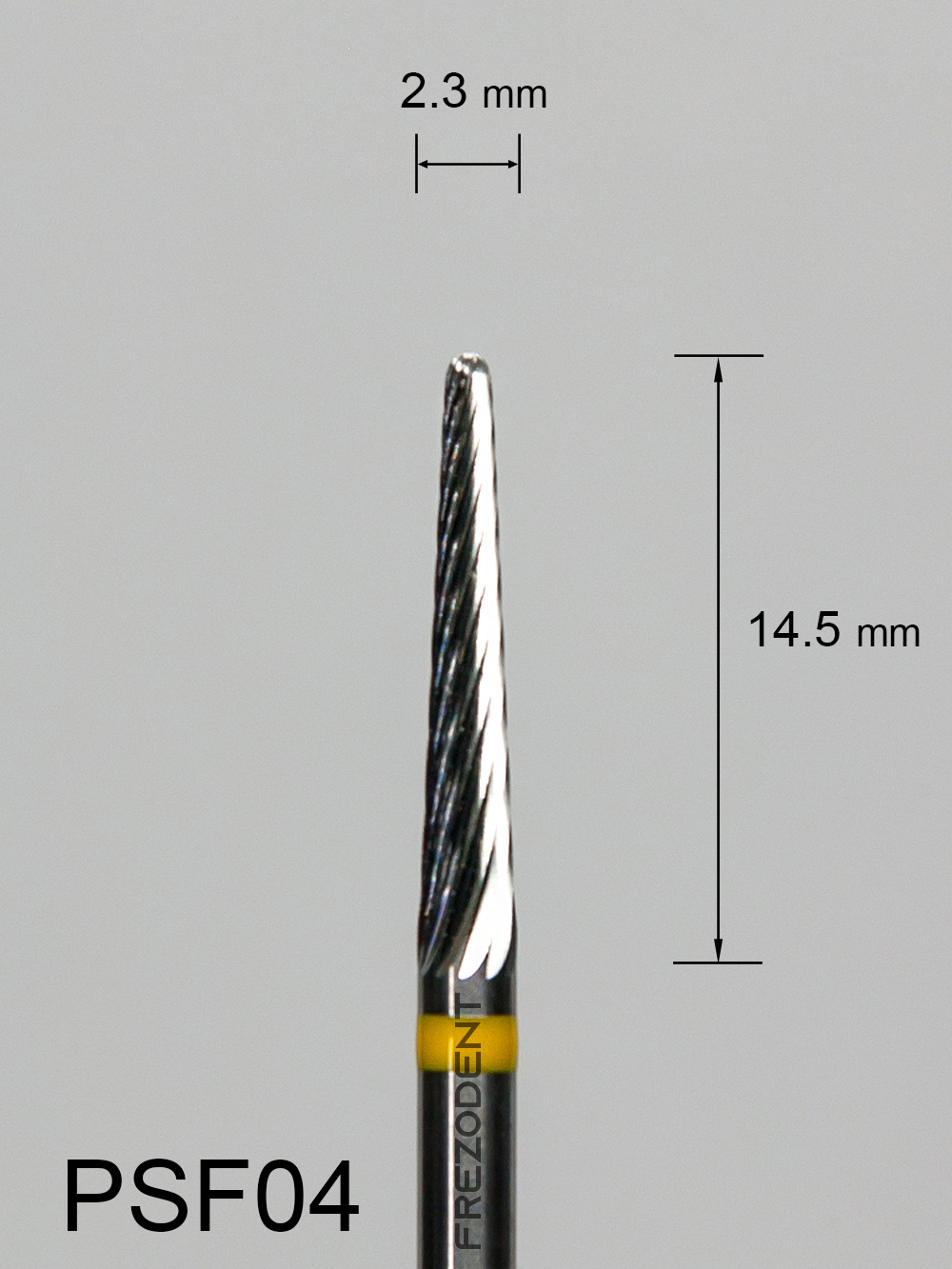 Frez węglikowy PSF04 stożkowy z bardzo drobnym pojedynczym nacięciem (żółty pasek) to narzędzie do precyzyjnej obróbki w technice dentystycznej. Nacięcie pojedyncze zapewnia mniejsze drgania i gładsze wykończenie powierzchni w porównaniu do nacięcia krzyżowego.