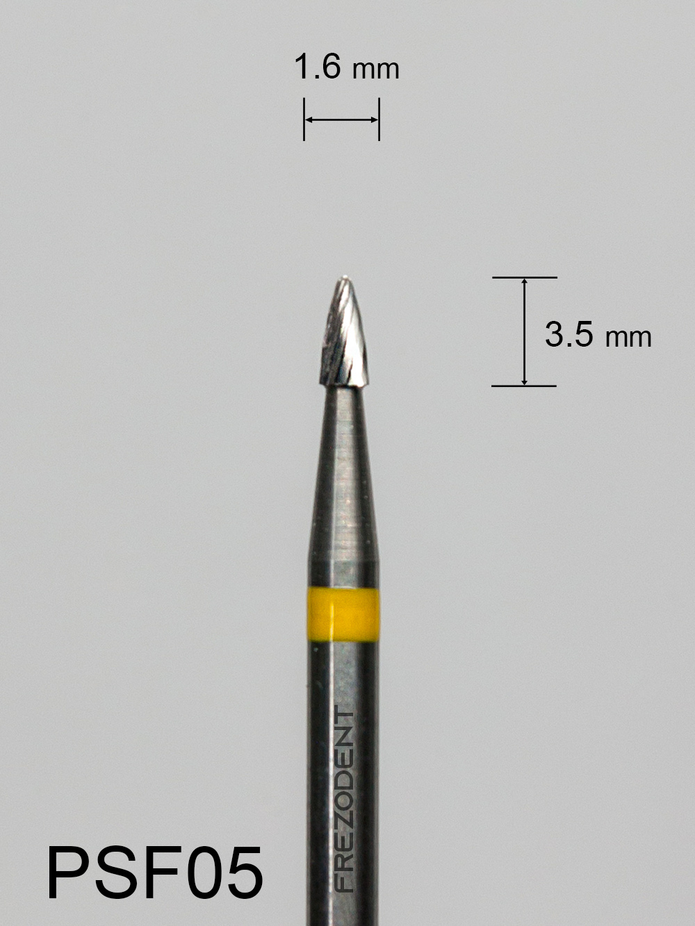 Frez węglikowy PSF05 mały wypukły z bardzo drobnym pojedynczym nacięciem (żółty pasek) to narzędzie do precyzyjnej obróbki w technice dentystycznej. Nacięcie pojedyncze zapewnia mniejsze drgania i gładsze wykończenie powierzchni w porównaniu do nacięcia krzyżowego.