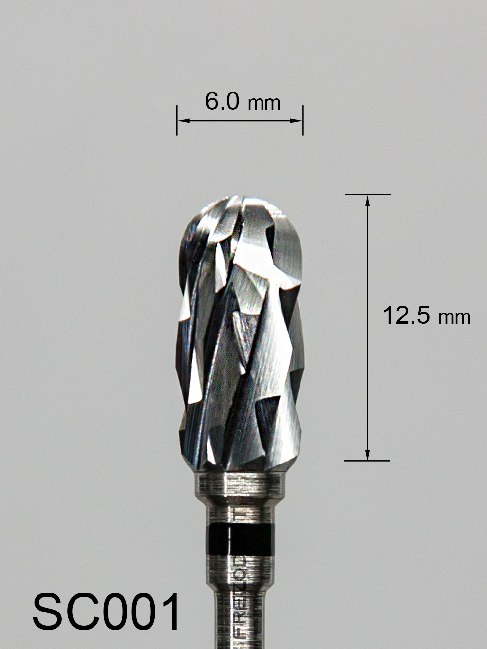 Profesjonalny frez protetyczny z serii przeznaczonej do najbardziej agresywnej obróbki, charakteryzujący się bardzo grubym krzyżowym nacięciem (oznaczenie czarnym paskiem). Frez ten jest stworzony do maksymalnie szybkiego usuwania dużej ilości materiału w fazie wstępnej. Kształt walca z zaokrąglonym końcem o średnicy roboczej 6,0 mm i długości roboczej 12,5 mm w połączeniu z bardzo grubym nacięciem sprawia, że jest idealny do:✅ Zastosowanie: