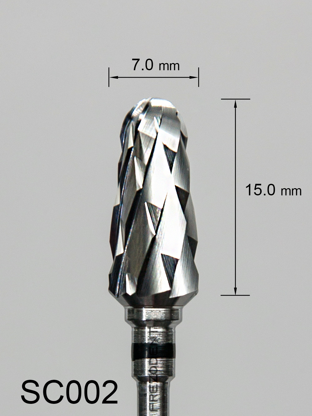 Frez węglikowy SC002 z bardzo grubym krzyżowym nacięciem (czarny pasek) – kształt stożkowy.