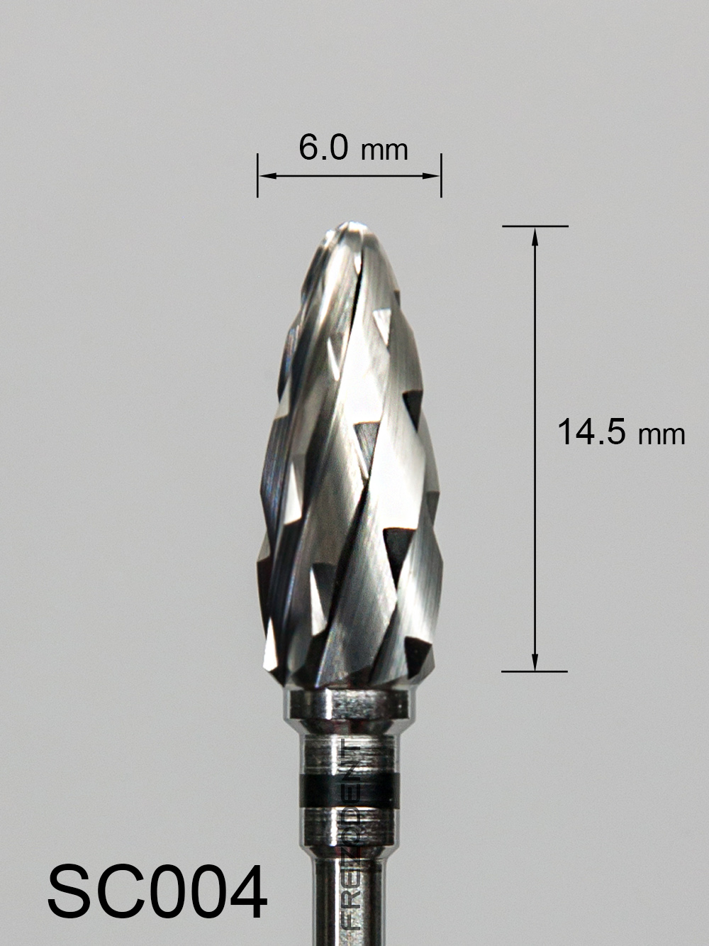 Frez węglikowy SC004 z bardzo grubym krzyżowym nacięciem (czarny pasek) – kształt wypukły ze zwężającą się końcówką.