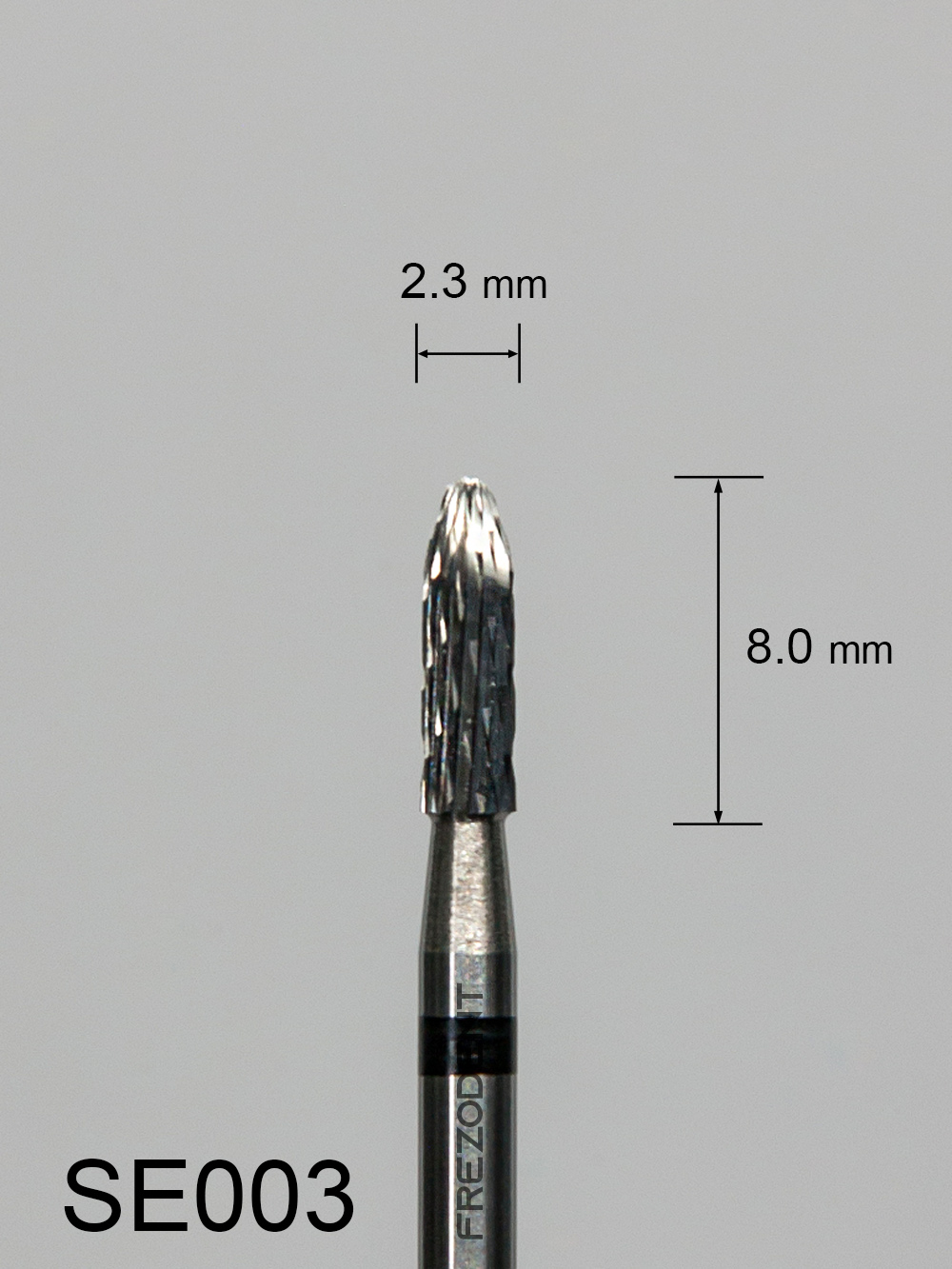 Frez węglikowy SE003 z wzdłużnym krzyżowym nacięciem (czarny pasek) – kształt walcowy ze zwężającym się końcem.