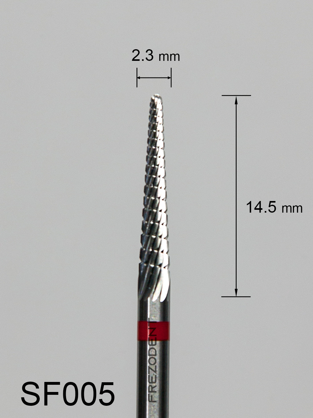 Frez węglikowy SF005 stożkowy z drobnym poprzecznym nacięciem (czerwony pasek) to wszechstronne narzędzie do obróbki w technice dentystycznej. Poprzeczne nacięcie zapewnia stabilne, równomierne cięcie i efektywne usuwanie materiału, jednocześnie zapobiegając zaklejaniu frezu.