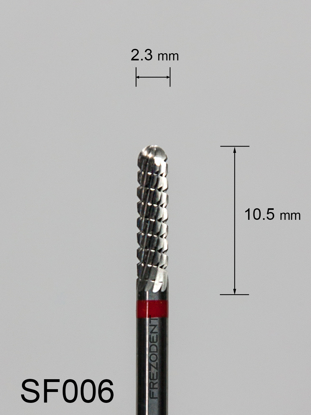 Frez węglikowy SF006 walcowaty z zaokrąglonym końcem z drobnym poprzecznym nacięciem (czerwony pasek) to wszechstronne narzędzie do obróbki w technice dentystycznej. Poprzeczne nacięcie zapewnia stabilne, równomierne cięcie i efektywne usuwanie materiału, jednocześnie zapobiegając zaklejaniu frezu.