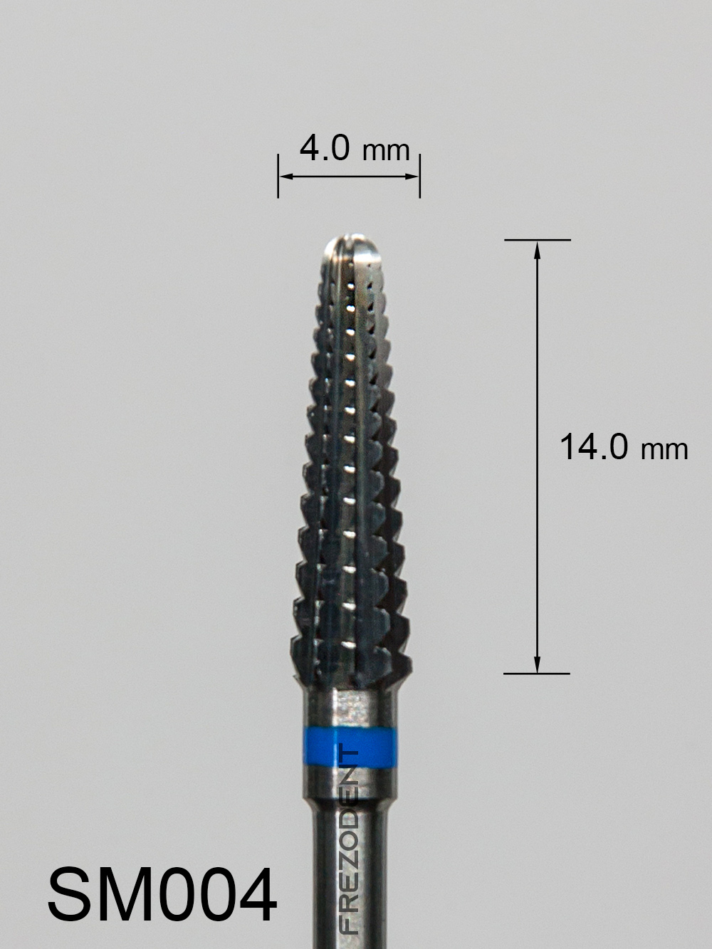 Frez węglikowy SM004 stożkowy z średnim poprzecznym nacięciem (niebieski pasek) to wysokowydajne narzędzie do intensywnej obróbki w technice dentystycznej. Poprzeczne nacięcie o średniej agresywności gwarantuje szybkie usuwanie materiału przy zachowaniu kontroli i zapobieganiu zaklejaniu frezu.