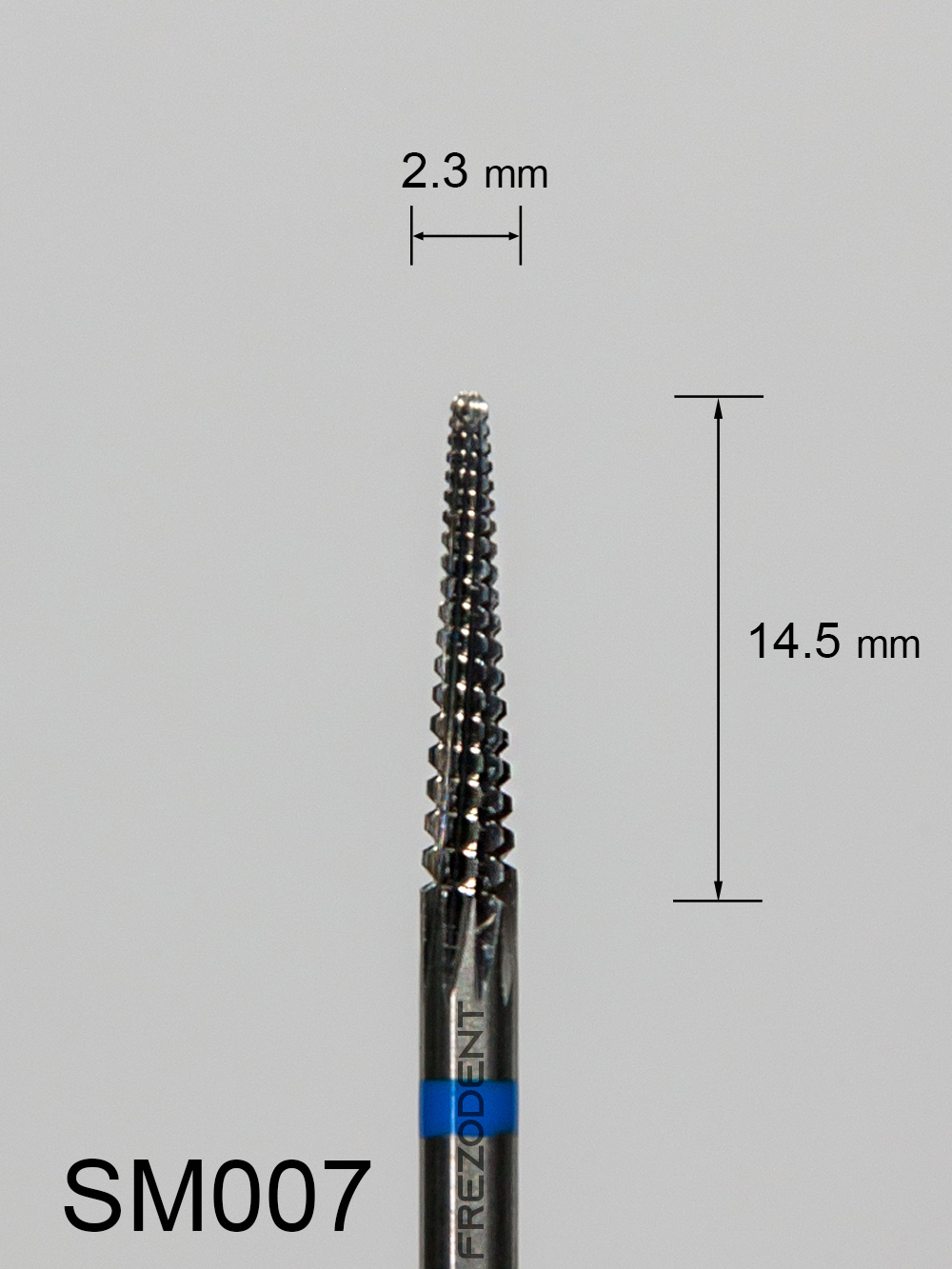 Frez węglikowy SM007 stożkowy z średnim poprzecznym nacięciem (niebieski pasek) to wysokowydajne narzędzie do intensywnej obróbki w technice dentystycznej. Poprzeczne nacięcie o średniej agresywności gwarantuje szybkie usuwanie materiału przy zachowaniu kontroli i zapobieganiu zaklejaniu frezu.