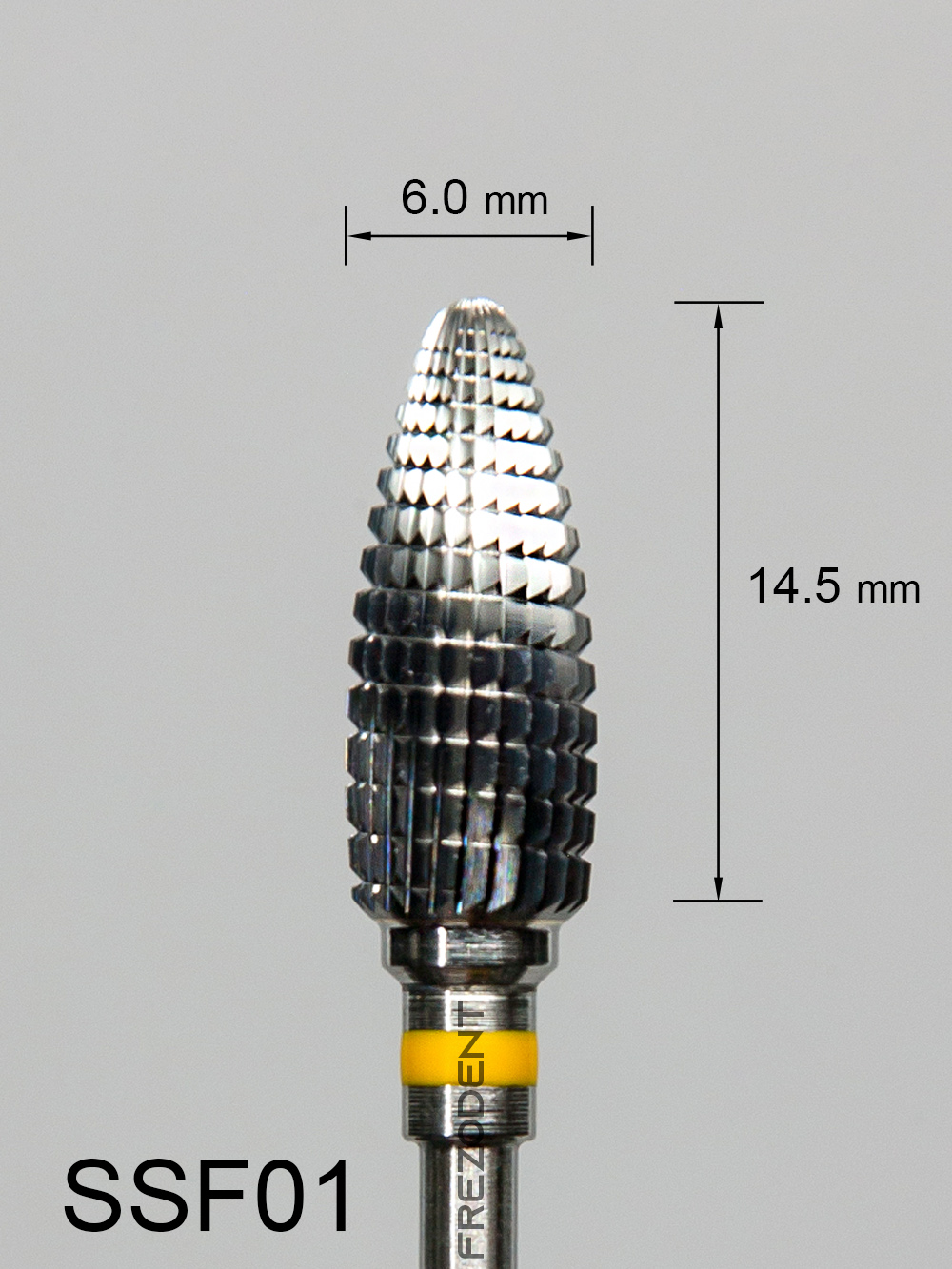 Frez węglikowy SSF01 wypukły z bardzo drobnym poprzecznym nacięciem (żółty pasek) to precyzyjne narzędzie do delikatnej obróbki w technice dentystycznej. Poprzeczne nacięcie zapewnia stabilne, równomierne cięcie i efektywne usuwanie materiału, jednocześnie zapobiegając zaklejaniu frezu.