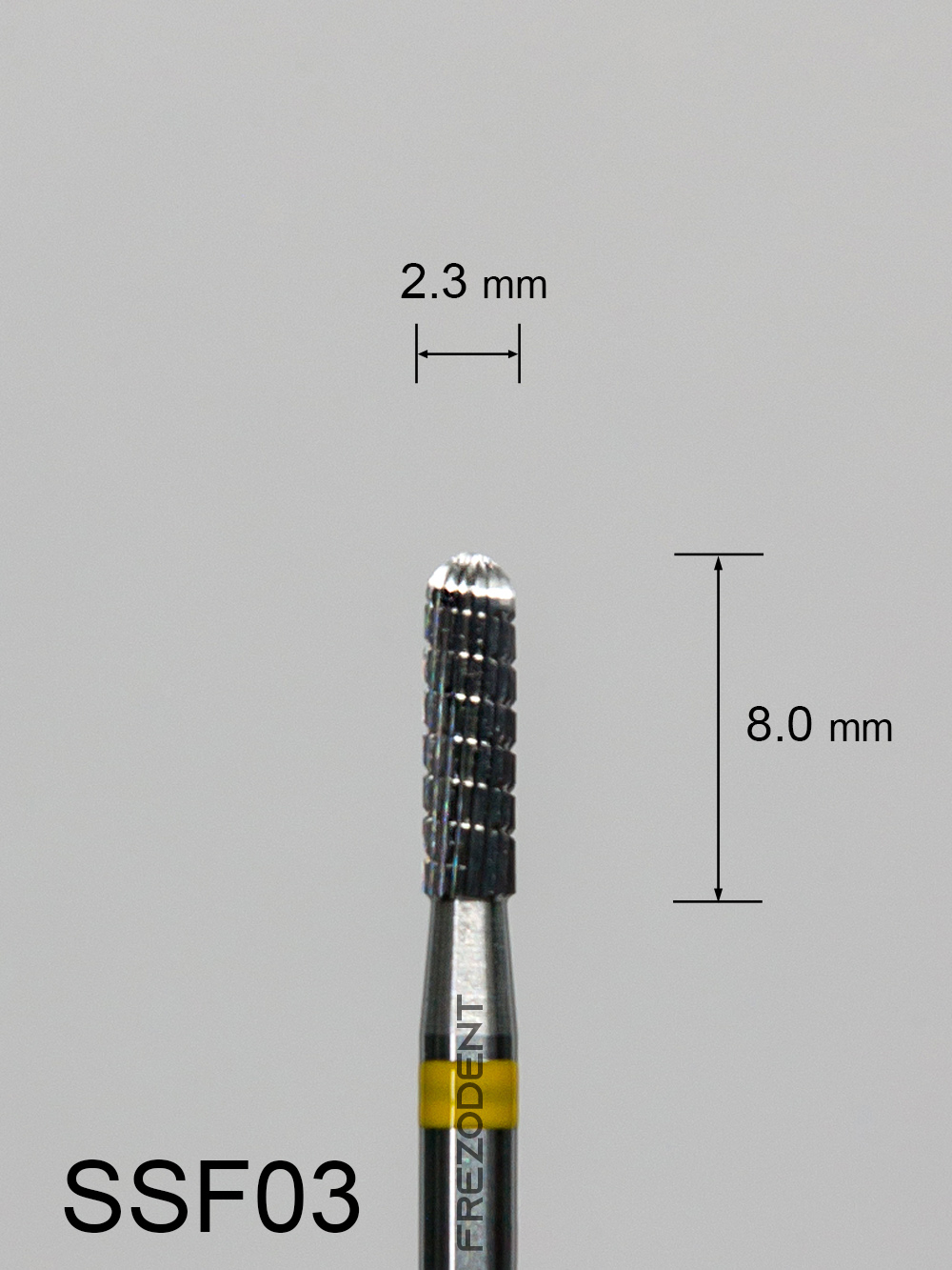 Frez węglikowy SSF03 walcowaty z zaokrąglonym czubkiem z bardzo drobnym poprzecznym nacięciem (żółty pasek) to precyzyjne narzędzie do delikatnej obróbki w technice dentystycznej. Poprzeczne nacięcie zapewnia stabilne, równomierne cięcie i efektywne usuwanie materiału, jednocześnie zapobiegając zaklejaniu frezu.