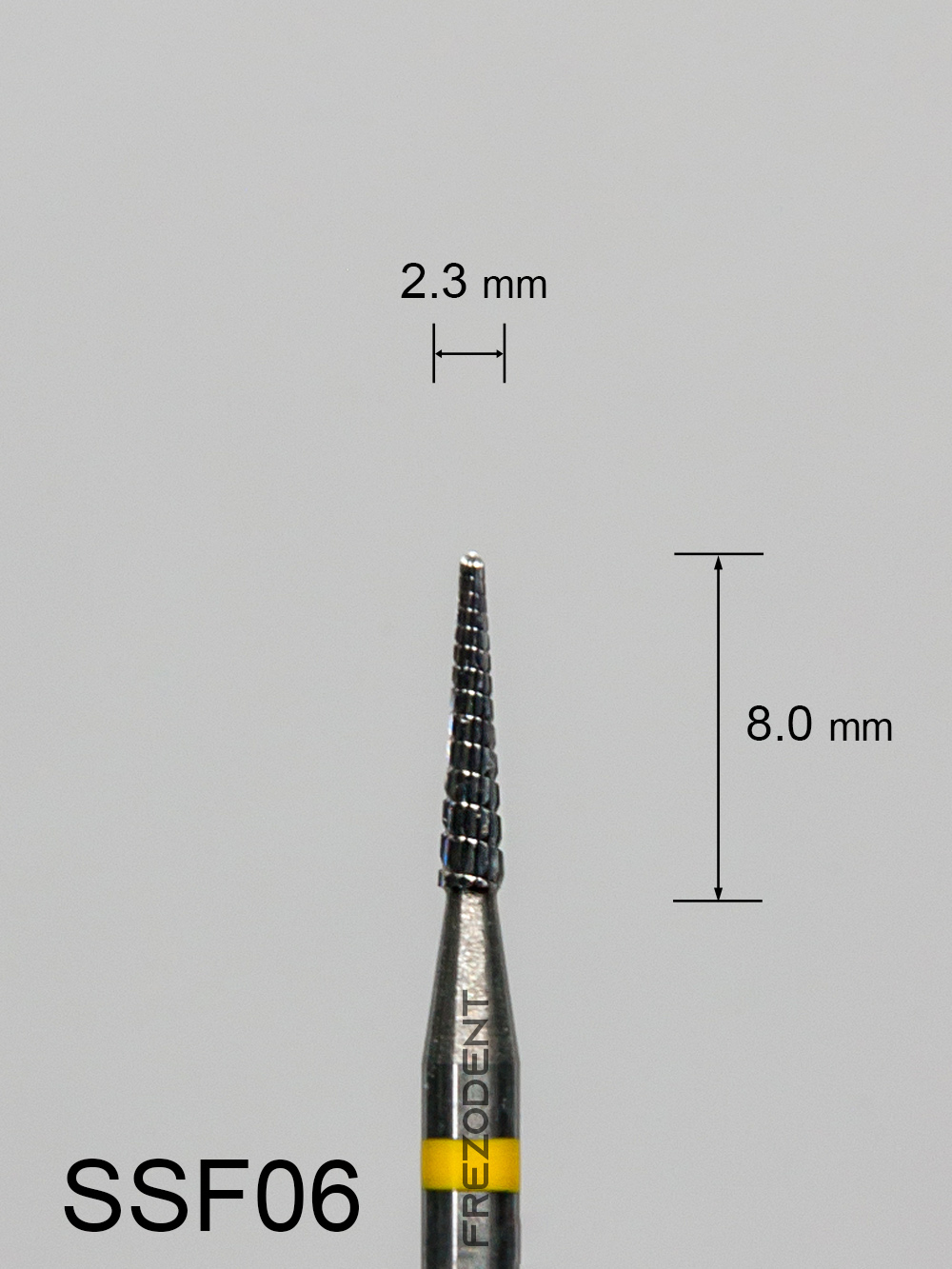 Frez węglikowy SSF06 stożkowy z bardzo drobnym poprzecznym nacięciem (żółty pasek) to precyzyjne narzędzie do delikatnej obróbki w technice dentystycznej. Poprzeczne nacięcie zapewnia stabilne, równomierne cięcie i efektywne usuwanie materiału, jednocześnie zapobiegając zaklejaniu frezu.