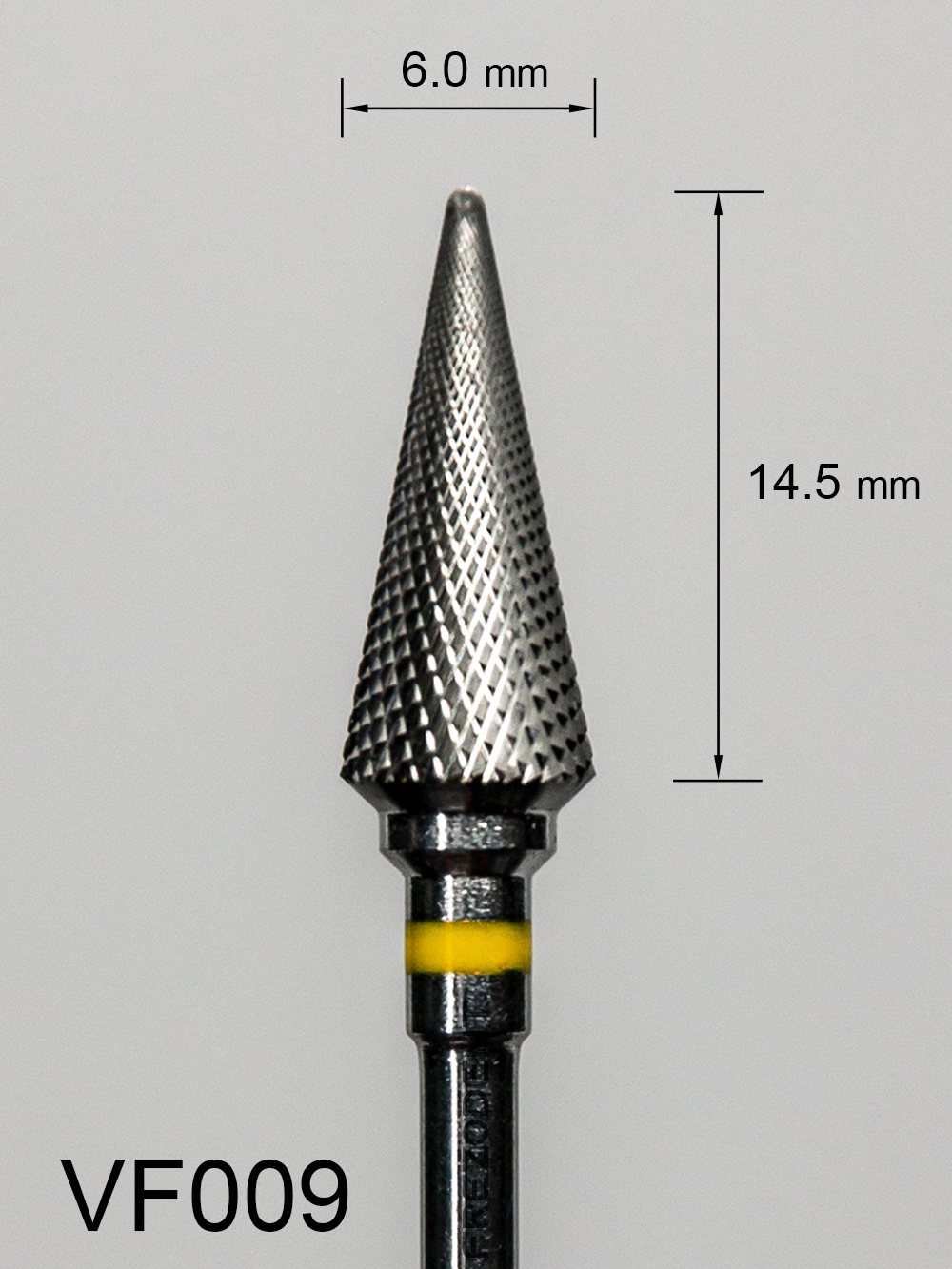 Frez węglikowy VF009 stożkowy długi z bardzo drobnym krzyżowym nacięciem (żółty pasek).