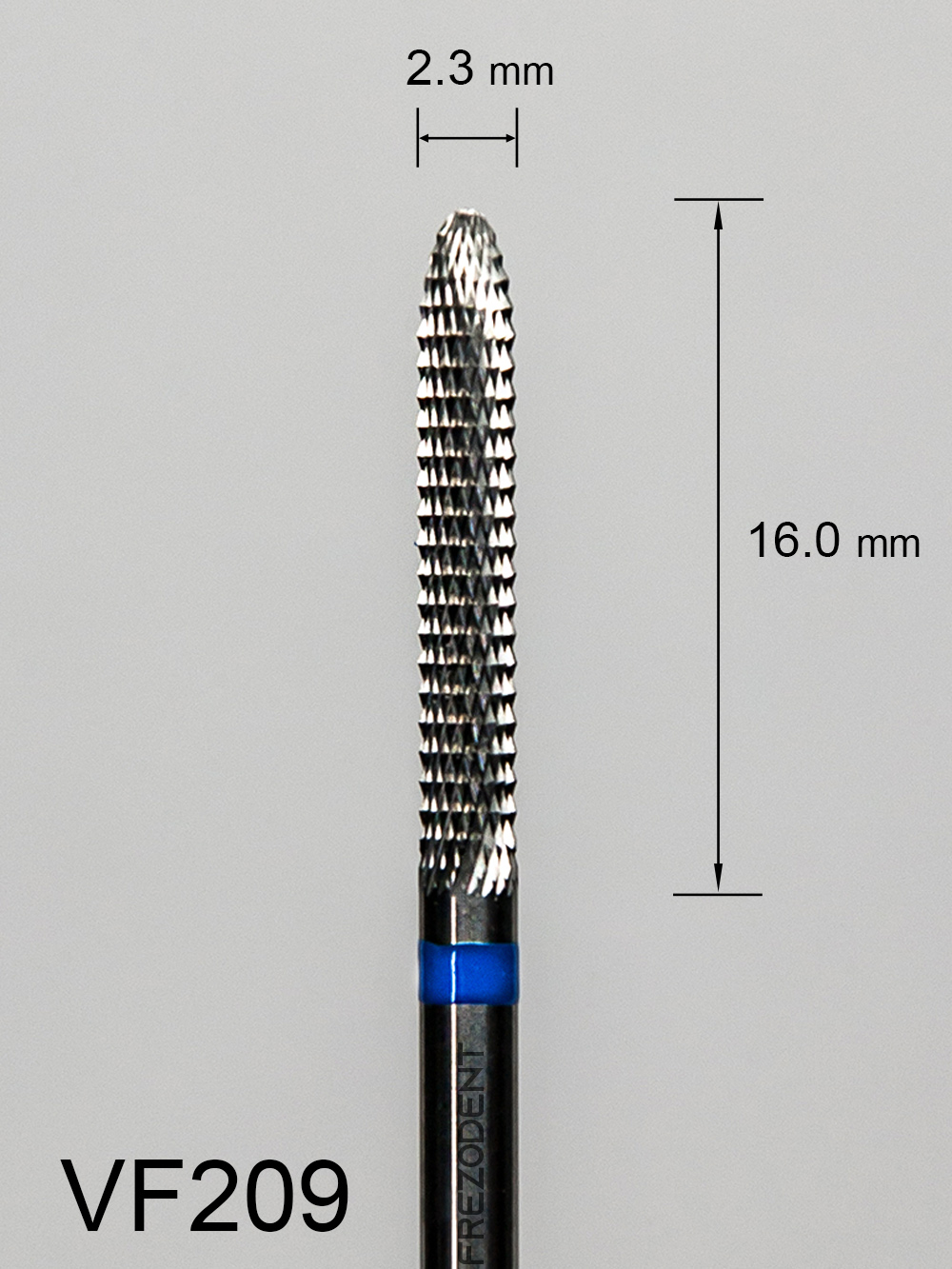 Frez protetyczny VF209 z walcowym ze zwężającym się czubkiem i „diamentowym” równoległym nacięciem (niebieski pasek).