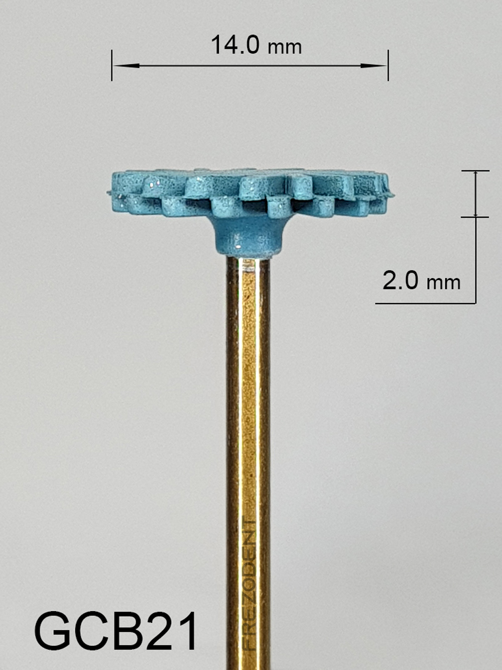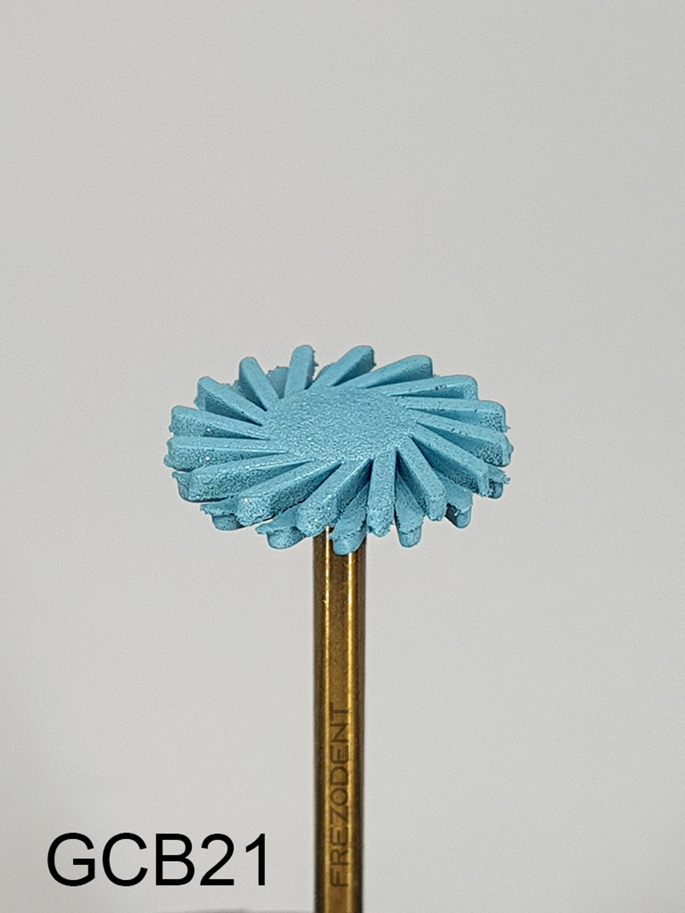Specjalistyczna polerka GCB21 posiada elastyczne lamele nasycone ziarnem diamentowym w całym przekroju. Kształt słoneczka umożliwia skuteczne wygładzanie trudnodostępnych miejsc, takich jak bruzdy na powierzchniach okluzyjnych oraz przestrzenie międzyzębowe, bez naruszania anatomii zęba.