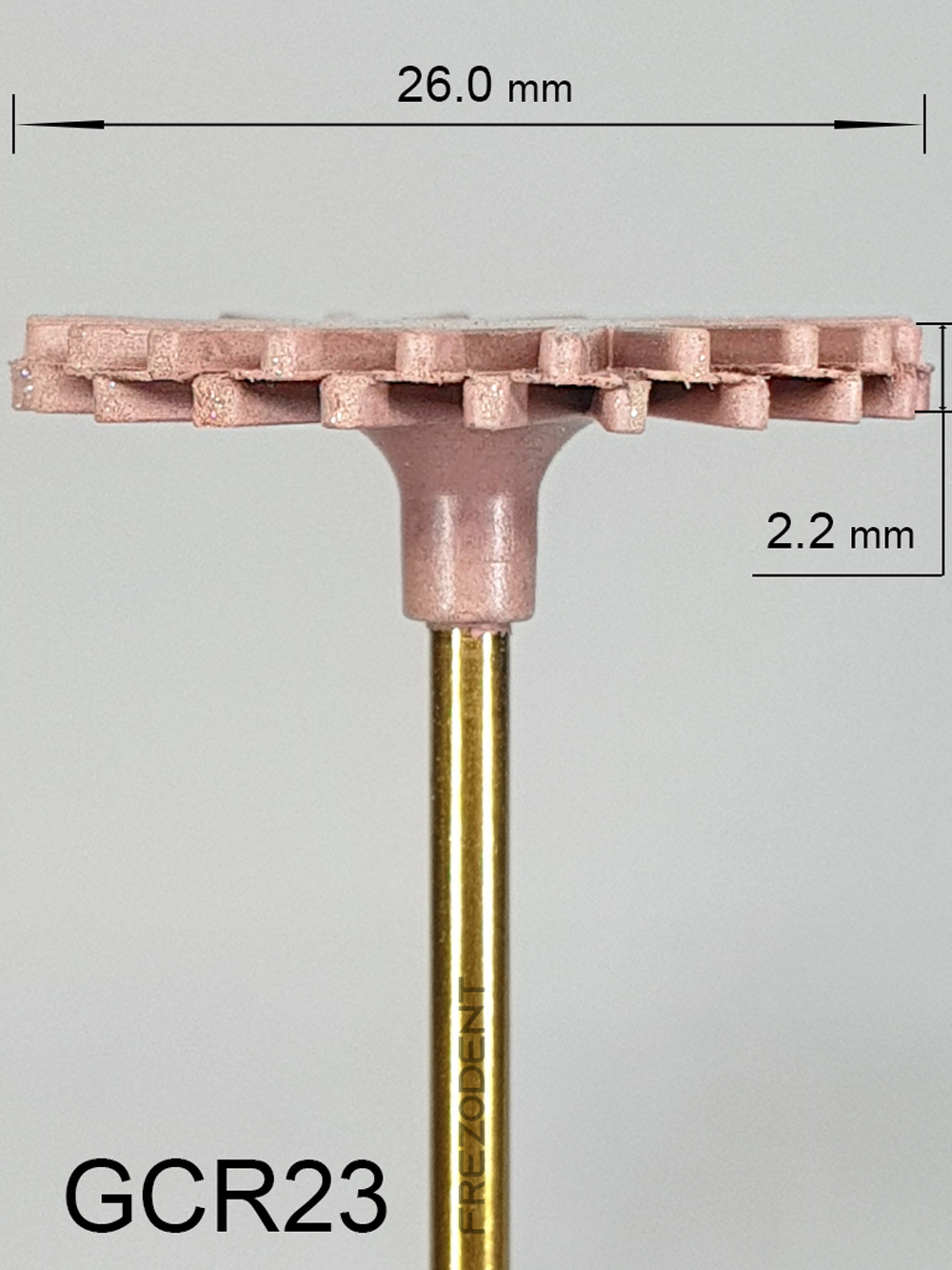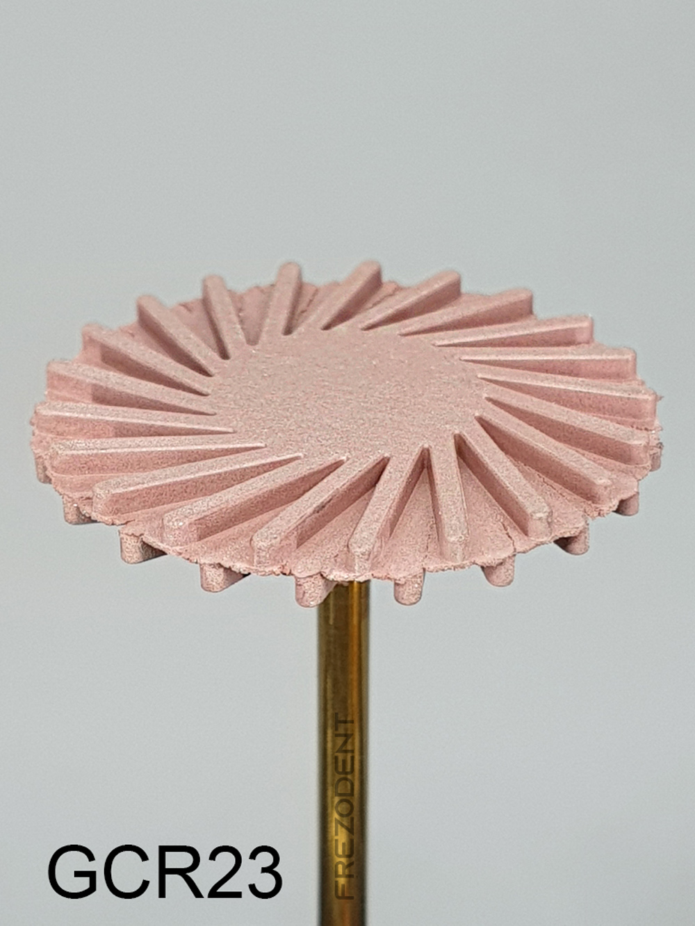 Profesjonalna polerka GCR23 posiada elastyczne lamele nasycone ziarnem diamentowym, co gwarantuje skuteczność aż do całkowitego zużycia. Kształt słoneczka pozwala na precyzyjne dotarcie do bruzd oraz zagłębień okluzyjnych, nadając powierzchni satynową gładkość bez ryzyka uszkodzenia delikatnych struktur anatomicznych.