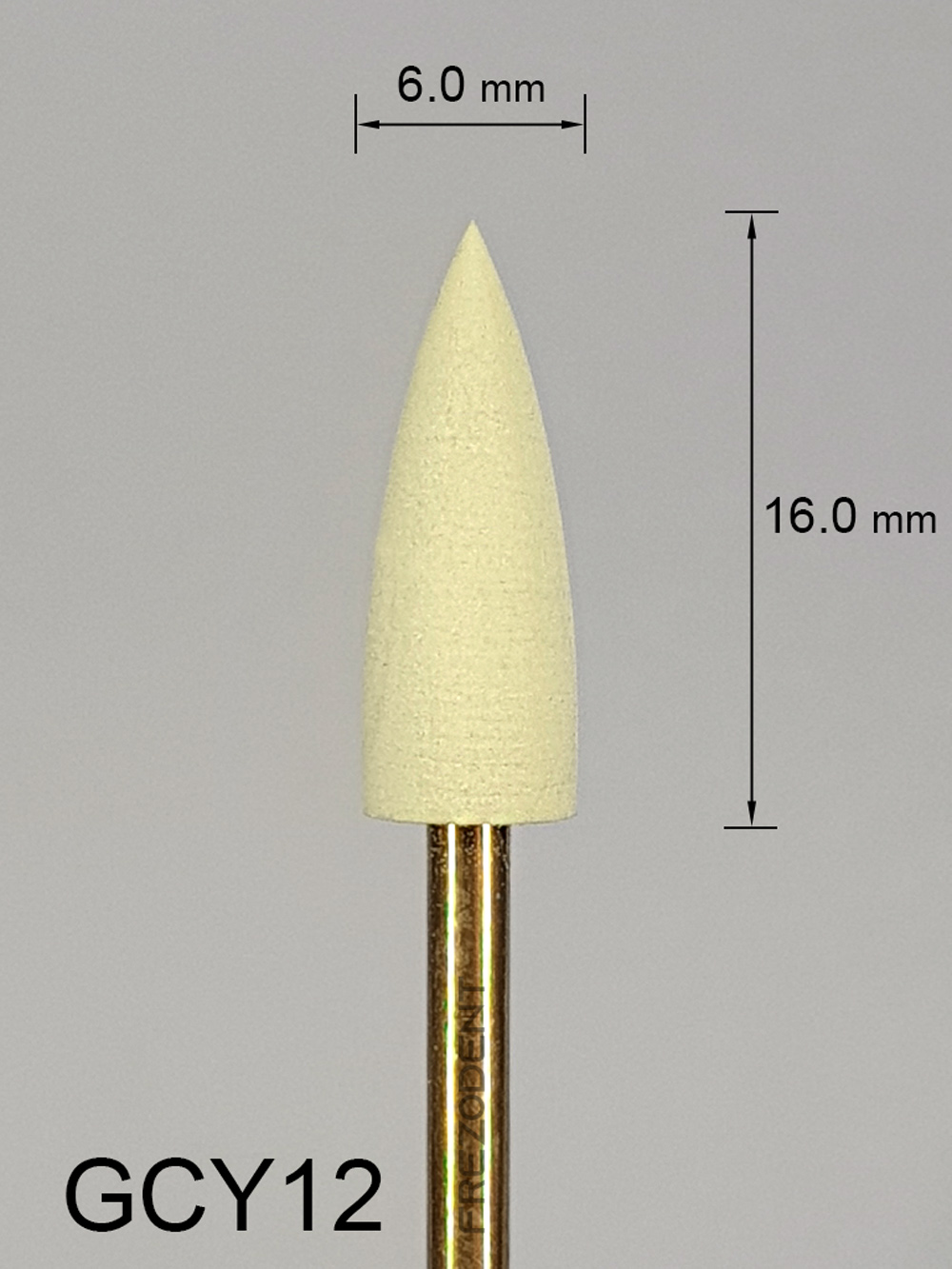 Specjalistyczny stożek GCY12 posiada drobne ziarno diamentowe zatopione w spoiwie, co pozwala na uzyskanie wysokiej gładkości powierzchni. Jest to etap polerowania wykańczającego, który przygotowuje uzupełnienie do uzyskania końcowego, lustrzanego połysku bez ingerencji w nadany wcześniej kształt.
