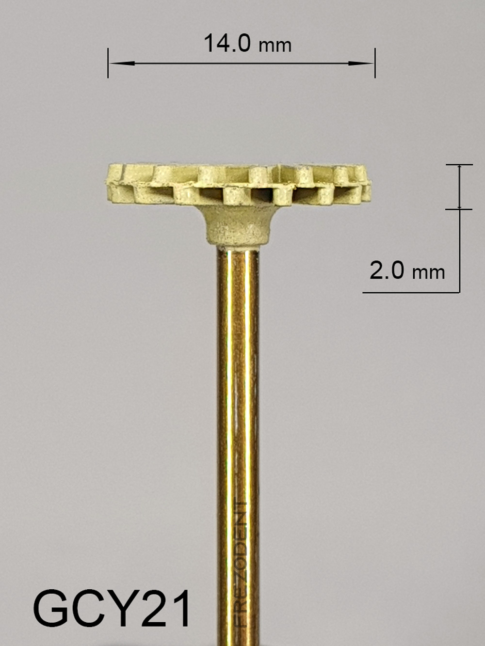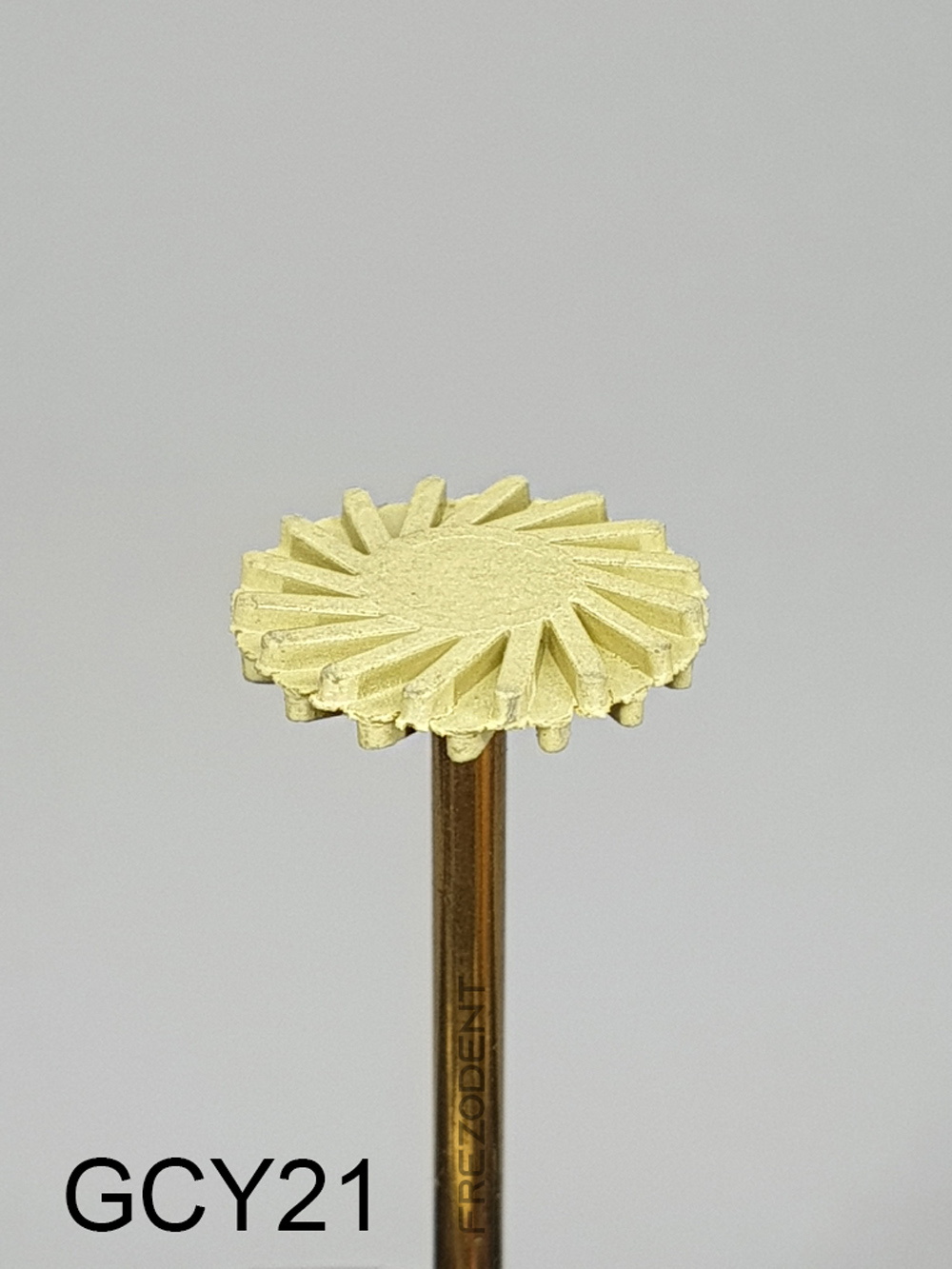 Profesjonalna polerka GCY21 posiada elastyczne lamele nasycone drobnym ziarnem diamentowym. Kształt słoneczka umożliwia precyzyjne nabłyszczanie trudnodostępnych miejsc, takich jak bruzdy okluzyjne i przestrzenie międzyzębowe, bez ryzyka zmiany nadanej wcześniej morfologii zęba.